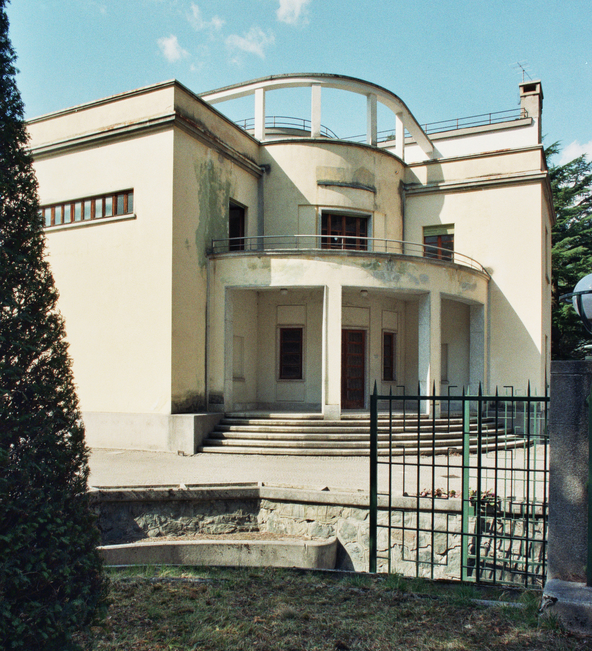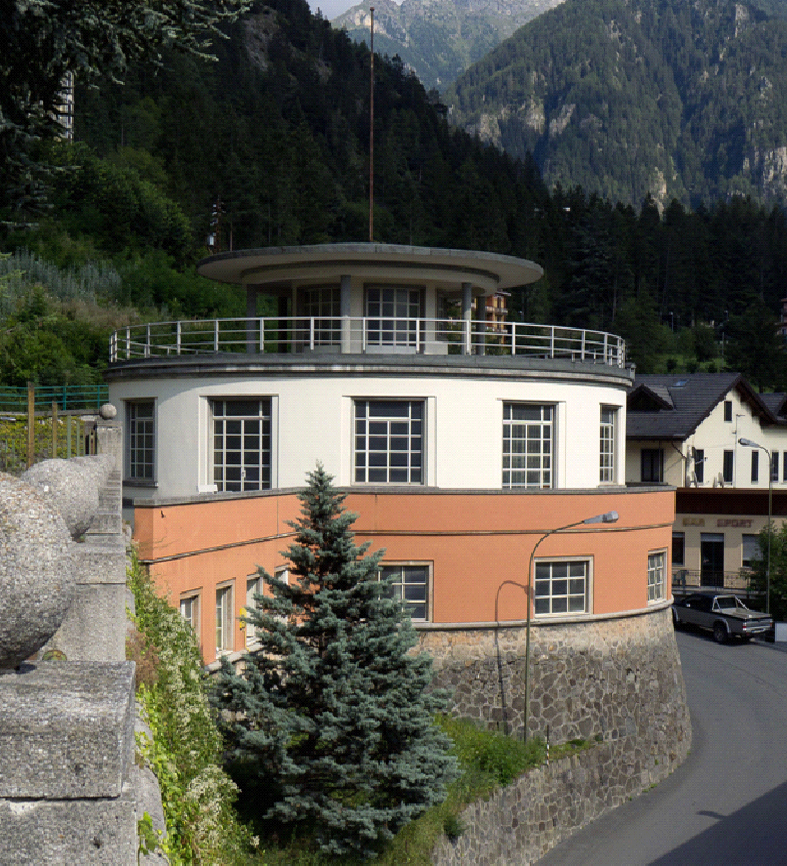 2. Villetta del direttore: edificio con pianta a L e volumi puri di ascendenza razionalista. L’angolo concavo è intersecato da un corpo cilindrico che funge da ingresso, con una scalinata circolare, un portico e un’altana sulla copertura. Si evidenziano alcuni temi modernisti quali le finestrature orizzontali e il tetto-solarium praticabile. Appare come una villla mediterranea tra i monti. 2. The director’s villa: L shaped building with pure volumes echoing rationalist style. A cylindrical body placed inside a concave corner serves as entrance, which has a curved staircase, a portico and a rooftop terrace. We highlight some modernist themes as the horizontal window placement and the accesible roof-solarium. It looks like a mediterranean villa in the mountains.
