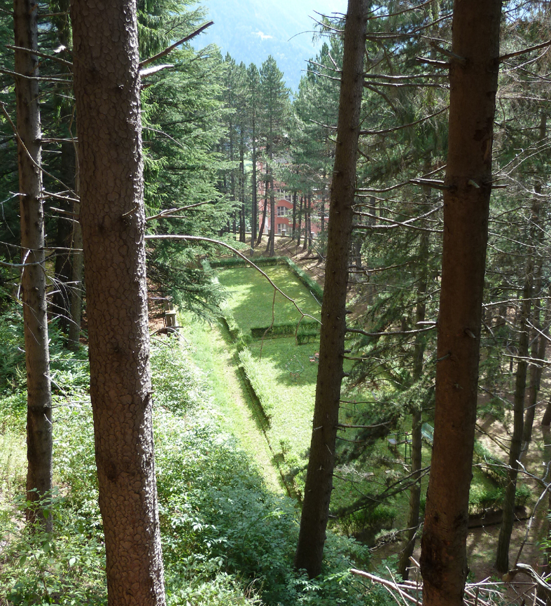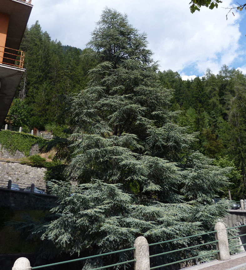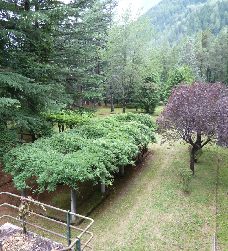 16. Il cedro: della trentina di essenze arboree, sicuramente la regina dell’intero parco, per numerosità, dimensioni e portamento. Presente nelle due specie Atlantica e Deodara, nessuno ricorda un impianto artificiale tanto ben attecchito e sviluppato a più di 1000 m. s.l.m. Le chiome blu-verde e la fragranza del loro legno continuano a caratterizzare in maniera inscindibile l’Ospedale Morelli con il suo parco. 16. The cedar tree: Among the about thirty different tree species it is the park queen for number, dimension and growth habit. Both its species Atlantica and Deodara are present. Nobody can remember such a well rooted and developed land planted artificially with forest trees over 1000 metres above sea level. The blue-green crowns and their wood aroma continue to characterize the Morelli Hospital with its inseparable park .