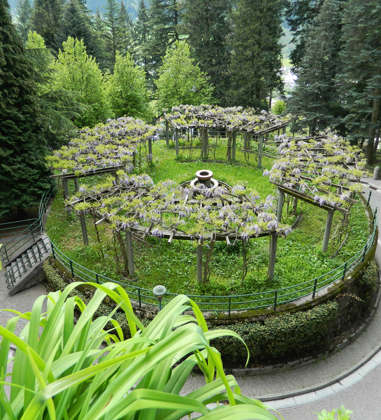 11. Giardini dell’VIII e IX pad.: laddove l’orografia non ha consentito la realizzazione di simmetrie non si è rinunciato alla razionalità, componendo gli spazi con aiuole geometriche comunque allineate con gli edifici di riferimento; parterre dagli angoli più acuti, pergolati e associazioni arboree più ricercate hanno trasformato gli estremi più remoti del parco in veri e propri tesori naturalistici. 11. VIII and XI pavilions gardens: where a symmetrical structure doesn’t occur in the orography, designers didn’t renounce to rationality and composed spaces with geometrical flowerbeds lined up with buildings of reference; squared parterres, pergolas and sophisticate combinations of tree types transformed the outer corners of the park into authentic naturalistic treasures.