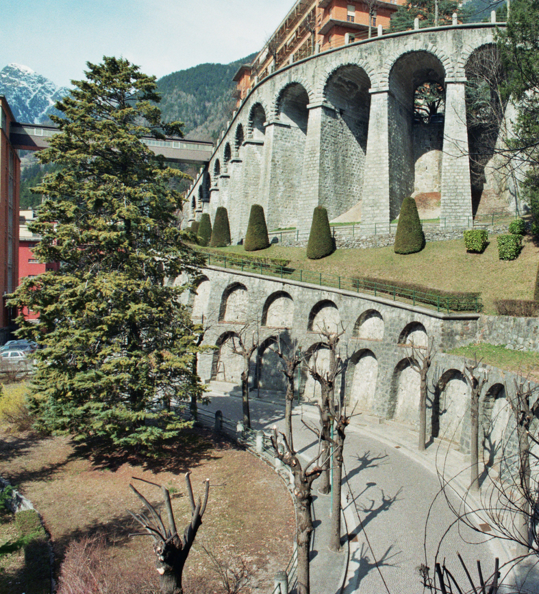 5. Strade e opere di costruzione del versante: dal tornante del primo padiglione la monumentale opera d’ingegneria – che si articola lungo tutto il complesso in un sistema di muraglioni in pietra ad arcate cieche, viadotti, gallerie e terrazzamenti – si ammira in tutta la sua forza espressiva. È il volto più classico del Villaggio, e ricorda le grandi opere d’ingegneria dell’antichità. 5. Roads and building works on the slope: from the first pavilion hairpin turn starts the majestic engineering work that can be admired in all its expressive power. It extends along all the Sanatorium complex in a compound system of stone walls with blind arcades, viaducts, galleries and terracing.